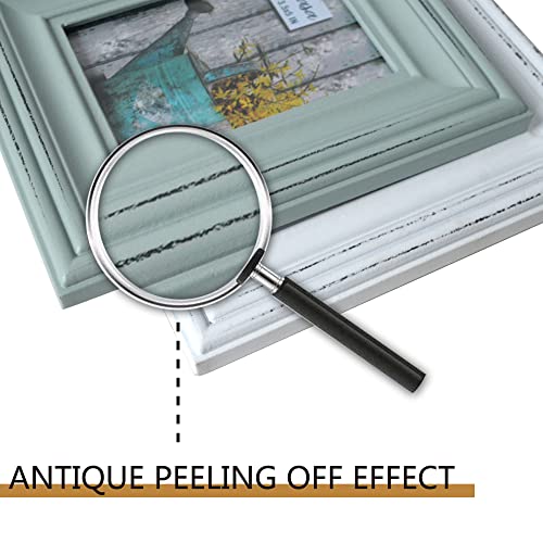 Rustic Farmhouse Decor: These solid wood and MDF picture frames feature a distressed, antiqued finish with peeled paint for a country, farmhouse look. The cyan and white color tones complement rustic home decor.