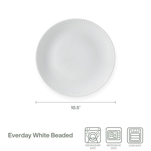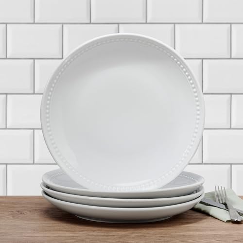 Perfect for On a regular basis dining or casual entertaining, this Set of 4 On a regular basis White Beaded Coupe Dinner Plates by Fitz and Floyd is fantastically crafted of crisp, white porcelain. Up to date, coupe-formed plates with raised rims highlighted by a beaded band brighten your table setting and complement any flatware or stemware. Set of 4 dinner plates, every measuring 10-1/2 inches in diameter by 1-1/2 inches prime. Microwave, oven, and dishwasher protected.