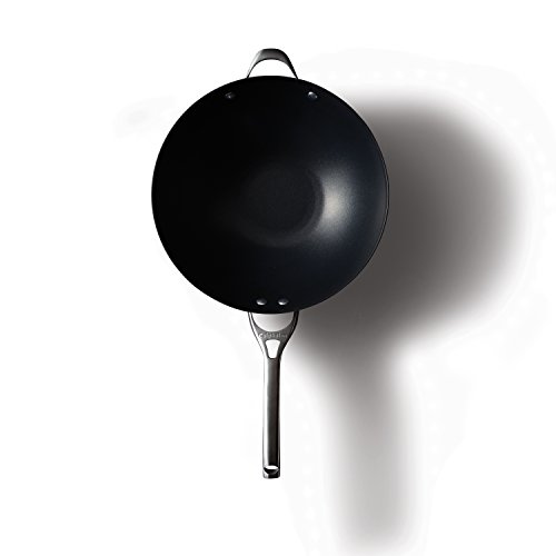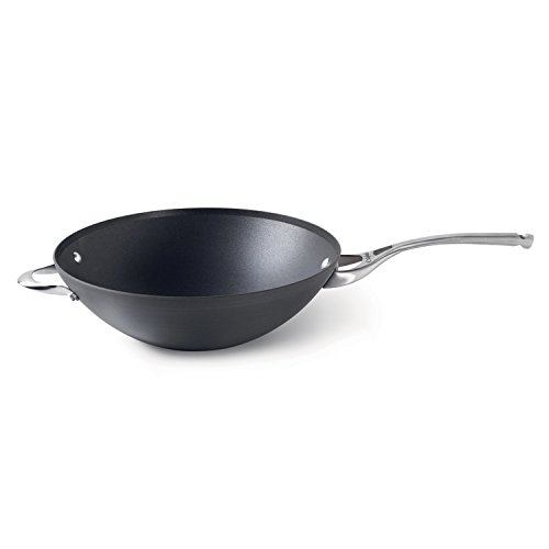 This 13-inch flat-bottom wok is an excellent example of the Contemporary Nonstick lines versatility as it cooks classic Chinese stir-fry dishes, such as Hunan Lamb, and is equally as useful for cooking soups or pan-frying fish up the sides. The pans exterior is made of hard-anodized aluminum for superior heat distribution. The interior is coated with a nonstick surface that is resistant to peeling, chipping, flaking, or cracking. This pan has one long ergonomic brushed stainless-steel handle and one loop handle–both of which stay cool to the touch on the stovetop and are riveted to the wok for durability. All Contemporary Nonstick cookware is oven-protected up to 450 degrees F and is covered by a lifetime warranty. –Cristina Vaamonde