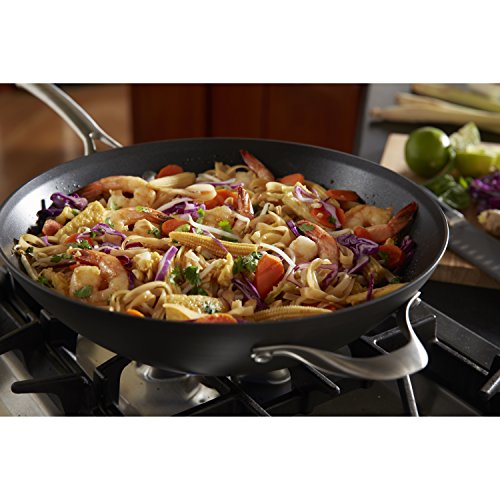 Featuring a hard-anodized exterior and nonstick interior. Calphalon ContemporaryNonstick combines durability and performance with fast clean-up and easy low-fat cooking.. Heavy-gauge aluminum construction ensures even heating and is hard-anodized for durability. It also makes it dishwasher-protected. Interior includes three layers of nonstick coating – two layers provide durability and the third layer offers easy release performance. The long, brushed stainless steel handles are designed to stay cool on the stovetop. Pans and covers are also oven protected, making it ideal for finishing a gourmet dish. Adapted from a traditional round-bottom wok, this flat-bottom wok has a wide cooking surface ideal for stir-frying on gas or electric ranges. The domed cover is perfect for steaming and simmering soups. The nonstick surface means you’ll cook healthier the use of less fat, with effortless cleanup. Comes with Calphalon’s full lifetime warranty. Triple-layer PFOA-free nonstick for lasting release