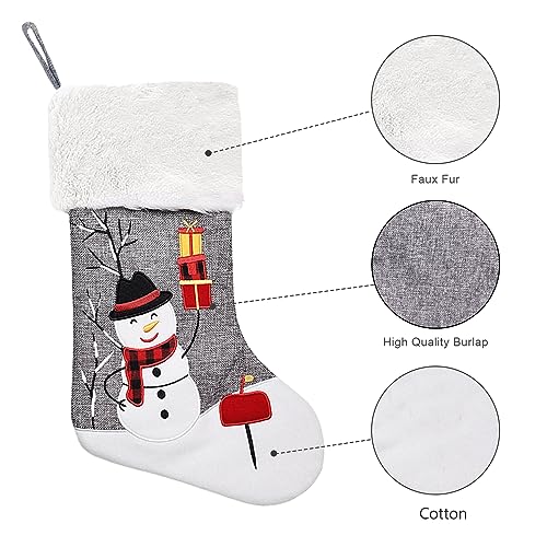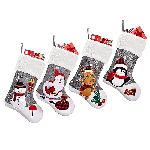 Christmas Stockings 4 Pack: Burlap Christmas stockings set of 4 with faux fur cuff, embroidered in 4 different Christmas character, Santa Claus, Snowman, Reindeer, Pengiun full of Christmas feelings. You can also use it to DIY your personal stocking craft by drawing or stitching on red cuff.