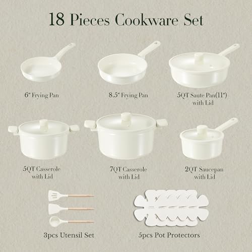 FULL SIZES&HIGH VALUE: This set provides pans from small to big ranges with 6”/8.5” frying pan, 5qt/7qt casserole, 5qt saute pan and 2qt saucepan with lid, 3 utensils and 5pcs pot protectors, perfectly meeting all of your demand within the kitchen.