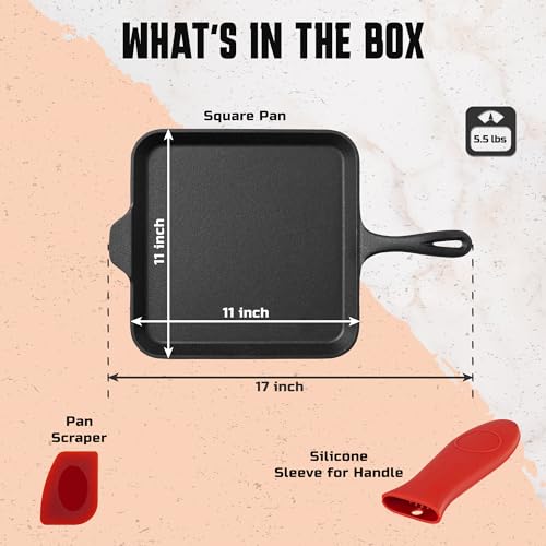 Versatile 11-Inch Square Cast Iron Griddle Pan : Ideal for searing, sautéing, baking, and grilling; Suitable for indoor and outside use on stove tops and campfires.