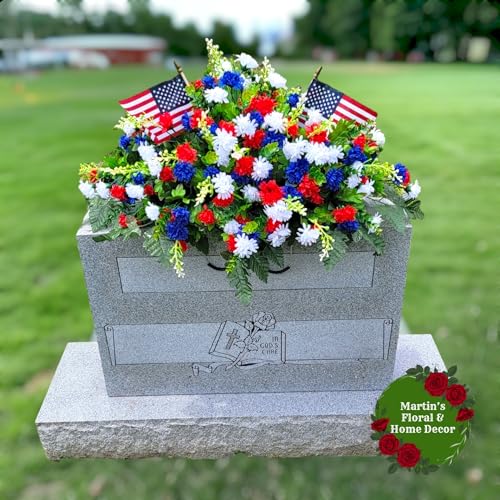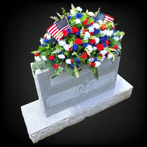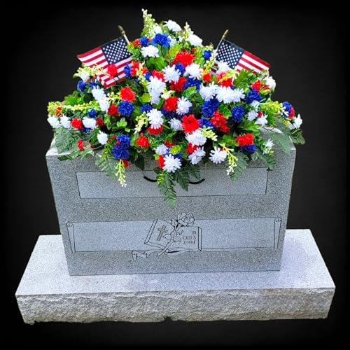 Cemetery Saddle Veteran Memorial Decoration – Realistic Silk Faux Floral Artificial Grave Flowers – Red White and Blue Patriotic Mini Mums for Headstone Decorating