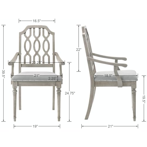 Rustic Farmhouse Design: This dining chair set showcases a perfect blend of classic farmhouse charm and up to date vintage elements. The geometric lattice carved openwork cutout design at the backrest adds visual appeal and enhances the chair’s breathability. The gently curved armrests provide a harmonious extension of the frame, complementing the chair’s aesthetic and offering added functionality. The grey wood frame and warm chenille fabric create a welcoming ambiance