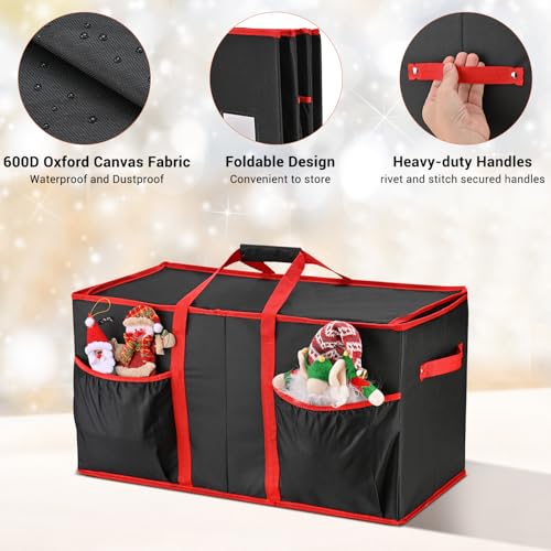 【Easy to Transport and Storage】: Strong handles on both sides of the Christmas organizer will let you easily move it from room to room, Longer handles on top of the box enable you to lift and drag it with ease. It may be folded without taking up space for easy storage