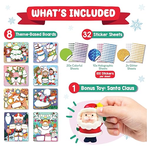 Holiday Special Sticker Art Activity – Kit includes 8 enchanting canvases, 32 sticker sheets (3000+ stickers) (including 2 tactile glitter sheets and 10 holographic glitter sheets), and one delightful santa claus toys.