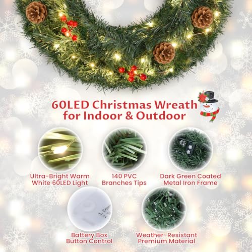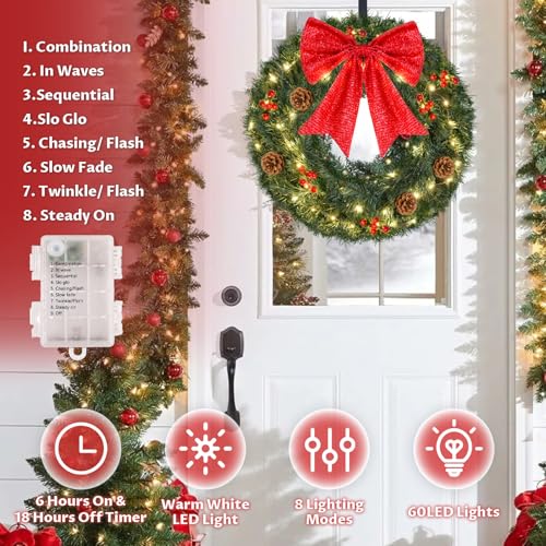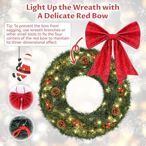 【More than a few Decorative Elements】The 24inch christmas wreath comes with a red bow, 5 berries and 5 natural pine cones, with all of the classic Christmas elements. The most thoughtful thing is that we also include a hook, so you’ll be able to easily hang the outdoor christmas wreath with lights on the door or window, saving the trouble of buying extra decorations and hooks, and creating a perfect holiday decoration at one time.