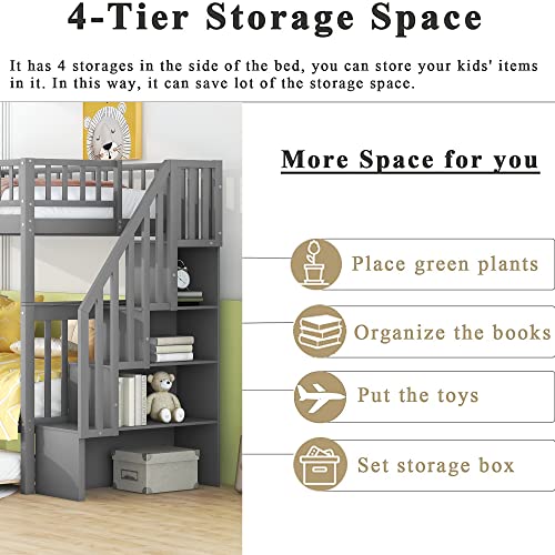 【4-step Stairs for Easy Access】Twin over twin bunk bed equipped with a sturdy four-steps stairs instead of a ladder, it brings safety, convenience and adventure experience for kids.and the upper bunk features a full-length guardrail to make sure safe,at the same time as the bottom bunk is designed to include both a headboard and footboard.