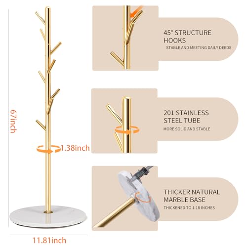 100% NATURAL MARBLE BASE:This coat rack freestanding is made of 100% natural marble. Carefully selected natural marble, each piece has a unique vein carved by nature (not a quality issue). The base is 11.81 inch in diameter and 1.18inch in thickness, very solid and able to fortify up to 180LBS, hang heavy winter coats and briefcases very firmly without wobbling