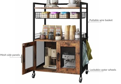 【A CABINET & PULL-OUT BASKET】-The coffee station has a cabinet with 2 doors. The coffee cart can store more coffee bar machines and food containers. This bar cart also has a pull-out wire basket drawer. You’ll put some tablewares, paper cups, k-cups, coffee filters, sugar cubes and tea bags in it for simple get entry to.