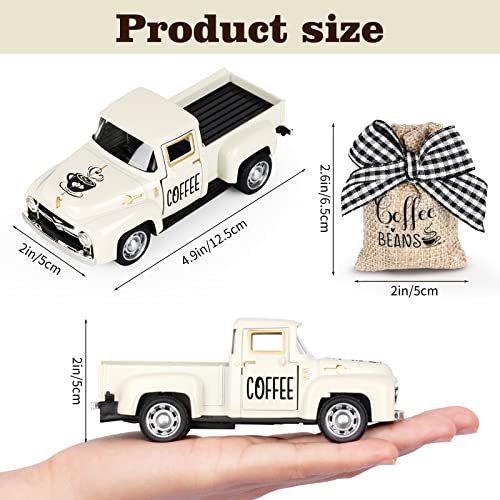 Package Includes: 1pcs coffee bar metal truck with a mini burlap sack, mini farmhouse coffee bar truck size is 4.9 x 2 inch and the burlap sack size is 2.6 x 2 inch, and is a smart coffee decor to place on a tiered tray, coffee table, kitchen countertop, or counter