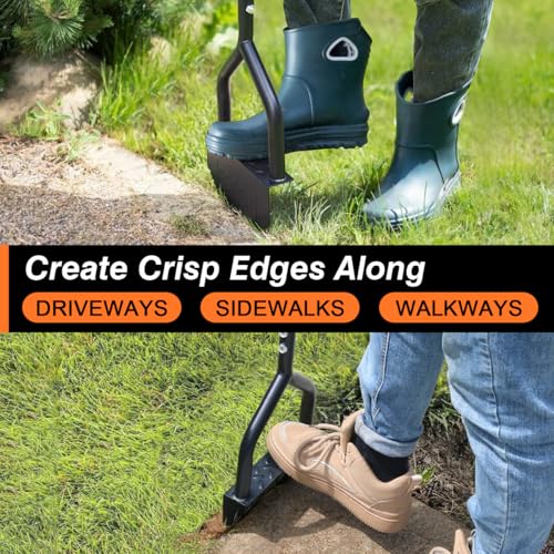 REASONABLY LIGHT IN WEIGHT YET BEASTLY STRONG — with a solid steel construction, this half moon edger chopper lawn tool is heavy-duty, long-lasting. The anti-slip, large foot tread of this grass edger not only ensure maximum comfort even as applying force by foot, but also high & wide enough for any types of shoes(6.3’’ width, 6.7’’height). The cushioned T-handle is easy to grip & keep watch over, bearing in mind twisting, rocking, levering, chopping.