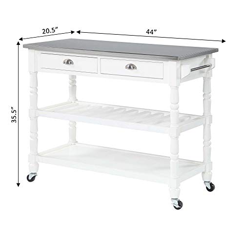The French Country 3 Tier Stainless Steel Kitchen Cart with Drawers by Convenience Concepts is the perfect addition to any transitional kitchen space. Providing functionality and efficiency for on a regular basis tasks, this traditional unit is sure to transform a staple in your house. The smooth stainless-steel countertop is an ideal efficient food prep station, and the stainless-steel towel rack allows for easy cleaning. Two additional shelves and two spacious drawers on smooth ball-bearing slides offer the entire storage one may need. The middle shelf is slatted giving the perfect space to store wine bottles or other kitchenware as well. This finely crafted piece is perfect for small kitchens, apartments, and anywhere you wish to have a little extra storage or kitchen prep space. Beautiful turned legs are engineered of sturdy solid rubberwood to make sure long-term durability. This portable cart is the perfect mobile storage space thanks to the 360-degree swivel caster wheels, two of which are locking. Available in a couple of finishes, you are sure to find a French Country 3 Tier Stainless Steel Kitchen Cart with Drawers by Convenience Concepts to match your current existing interiors. Please note that this cart is not intended for use as a cutting board.