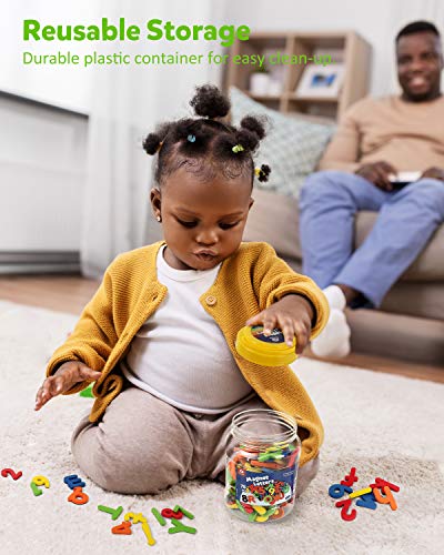 Bright and Vibrant Color with Magnetic Letters: Fridge magnets set with five different colors ( red, green, blue, orange, yellow). All comes in a sturdy plastic canister featuring snap shut cover with deal with for simple storage that encourages your children to learn to organize, sort, & classify all through clean-up time.