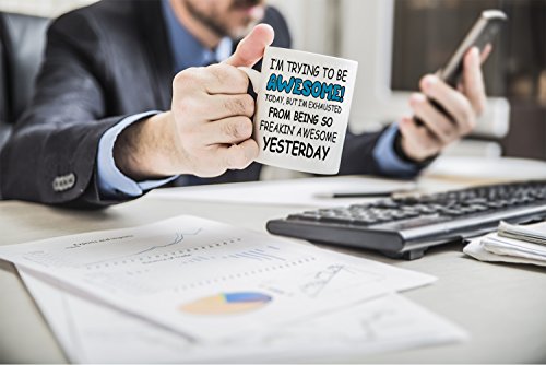 Let Your Mug Speak For You: Our I’M TRYING TO BE AWESOME TODAY, BUT I’M EXHAUSTED FROM BEING SO FREAKIN’ AWESOME YESTERDAY mug is enough to make anyone smile, whether you use it at home or at your workplace, at your desk or in the break room. Share a smile with anyone on your gift list, whether they’re a boss, co-worker, employee, friend, family member, or anyone else. Break the ice with new co-workers and in meetings with this zesty, fun coffee mug, or give a gift without going over budget.