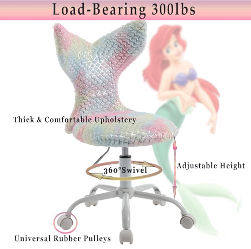 • Cute Kids Desk Chair Soft Fuzzy Computer Chair for Girls Teen Reading Study Adjustable Swivel Rolling Task Chair Vanity Chair with Little Mermaid Sparkling BackPink Rainbow