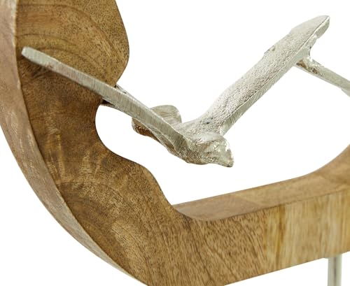 SILVER AND WHITE HOME DECOR FIGURINE: Natural golden-brown and beige wood tones, textured metallic silver birds, and white stone with natural veining adorn this round decorative statue