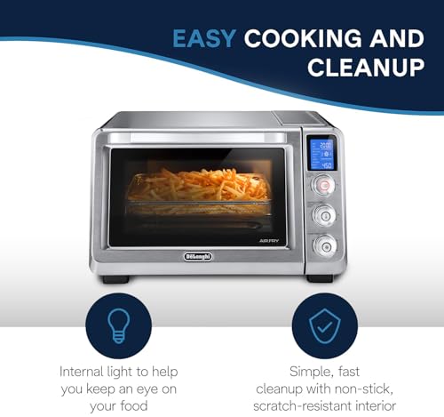 The De’Longhi Air Fry Oven uses True European convection to prepare your favorite culinary cravings—from crunchy zucchini crisps to juicy chicken tenders—up to 40% faster. Save energy with this countertop appliance that efficiently air fries, toasts, bakes, boils, grills, defrosts, or reheats your whole favorite foods. Exclusive heat lock technology maintains an even temperature, ensuring that your meals are cooked to perfection. Meanwhile, an interior light permits you to monitor progress at any point—without disturbing the cooking process. Low-maintenance and easy to clean, this Circle of relatives-sized toaster oven is equipped with the entire accessories you want, including an air fry basket, wire rack, crumb tray, baking pan, and pizza pan. Enjoy versatile possibilities and an effortless setup, each time.