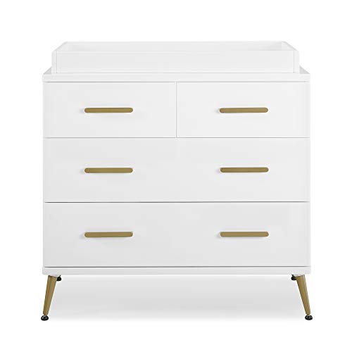 4 DRAWER DRESSER: The Sloane 4 Drawer Dresser with Changing Top by Delta Children is the ultimate piece of kids’ furniture. Sleek and modern, it boasts a mixed material design with bronze splayed feet and drawer handles that make it elevated enough for your master bedroom. But this dresser is more than just fashionable—it’s super functional, too. It features four spacious drawers for ample clothing storage and includes a removable changing top that creates the easiest space for diaper changing. Remove the changing top to create a more grown-up space later on.