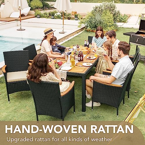 Elegant Out of doors Dining: This classic 9-piece patio dining set from Devoko includes a hand-woven rattan design with an acacia wood table top, offering a wonderful and functional addition for your Out of doors living space.
