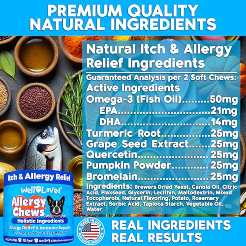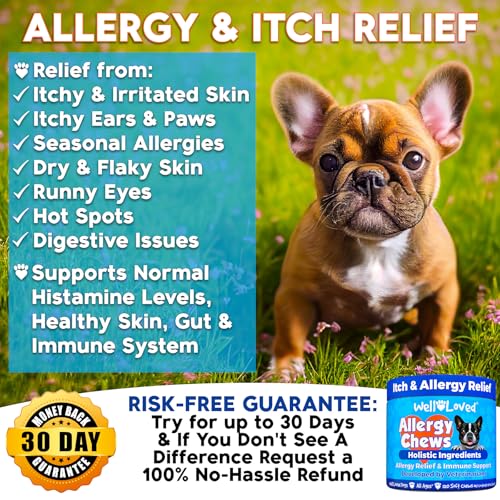 Dog Allergy Relief – Well Loved Allergy Chews are a veterinarian really helpful dog itchy skin remedy which provide dog anti itch relief and allergy Give a boost to. It is a secure and effective dog hot spot remedy that calms irritated dog dry skin, itchy ears, red and water eyes caused from occasional or seasonal dog allergies.