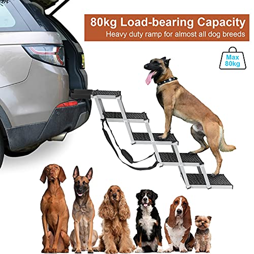 🐶【PERFECT SOLUTION】: SEEZSSA pet step is designed for those large dogs, medium dogs and old pets who have hip dysplasia or other weak mobility problems, and elder pets be afraid of falling. With height adjustable mechanism (45-73 cm), the car dog ramp is easy to rest against most cars, trucks, SUV and 4×4, so your dog will get out and in without any trouble