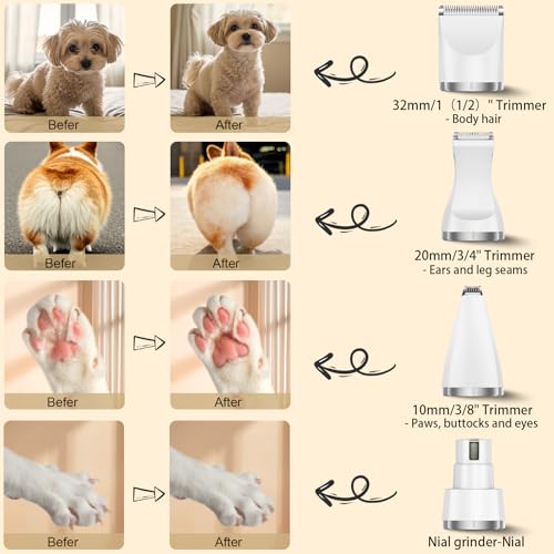 4-in-1 Pet Grooming Tool: This lightweight electric cat paw trimmer is designed for easy transport and features four interchangeable attachments: a standard blade, a narrow blade, a detailed blade for intricate areas, and a nail grinder. Effortlessly switch between heads to groom your pet’s feet, belly, face, legs, and even those tricky spots around the ears, making the pet hair trimmer tool ideal for full-body grooming on small to medium-sized cats and dogs.