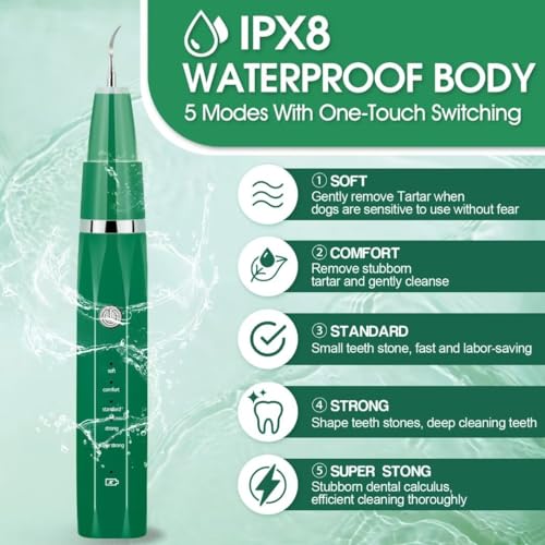 FULL BODY WASHING + FIVE MODES: IPX8 waterproof for simple rinsing. The dog teeth cleaner features five modes—Soft, Comfort, Standard, Power, and Ultra—with one-touch switching. Use Soft mode first of all for best results