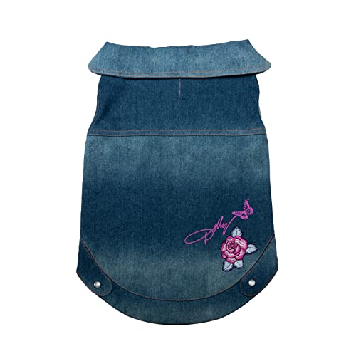 Doggy Parton stitched blue jean denim jacket with collar and leash hole for dogs; features faux pearl snap button detail and Dolly’s signature butterfly