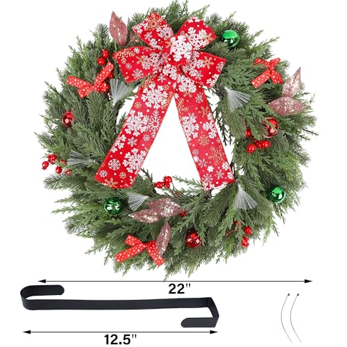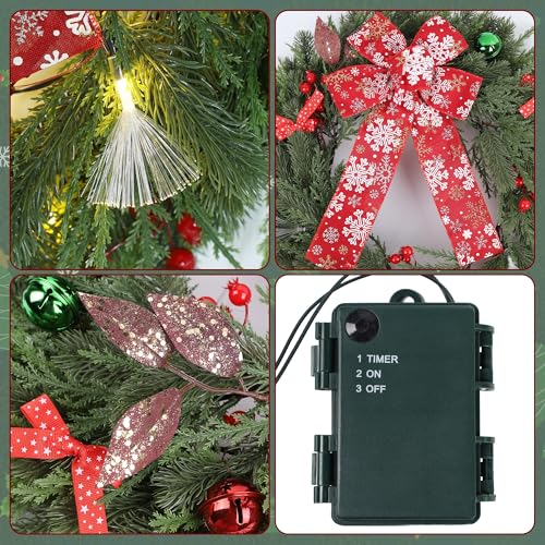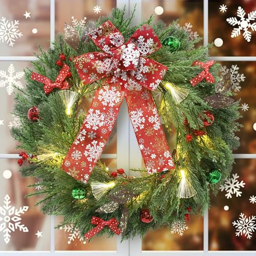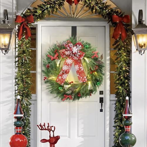 Festive Charm: Each intricate detail, from the dazzling Christmas ornaments to the striking red bow embellished with snowflake patterns, is meticulously crafted to captivate the hearts of all who see it. This pre lit artificial Christmas wreath is more than just a decoration, it’s a true remark of holiday spirit.