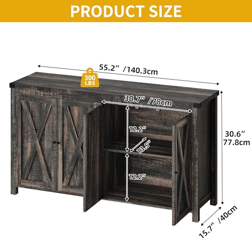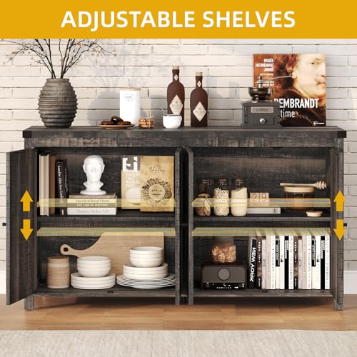 Ample Storage Space: The kitchen buffet cabinet features a 4-door cabinet with an adjustable shelf to store coffee beans, spices, and some sundries. The 55″ wide tabletop makes it accessible to display a microwave, toaster, and coffee maker. The dimensions are 55.2”W x 15.7″D x 30.6”H, and with a maximum weight capacity of 300lb, you’ll expectantly place your appliances.