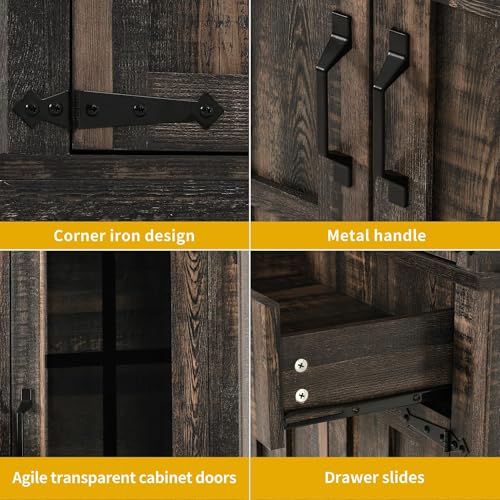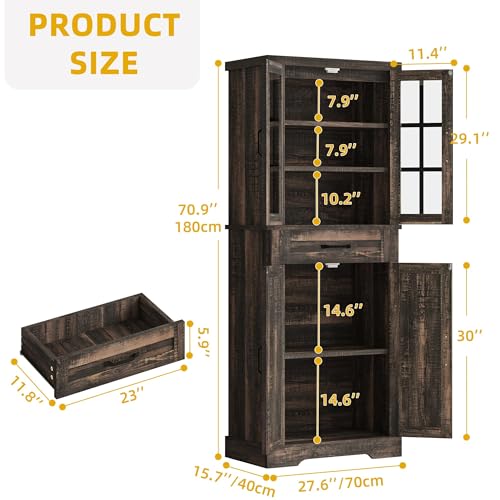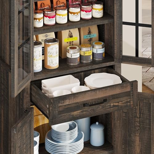 Spacious Rustic Storage Solution: This large pantry cabinet from DWVO offers ample storage space with more than one compartments, including upper and lower cabinets with adjustable and fixed shelves, in addition to a spacious drawer, ideal for organizing food, utensils, and kitchenware.