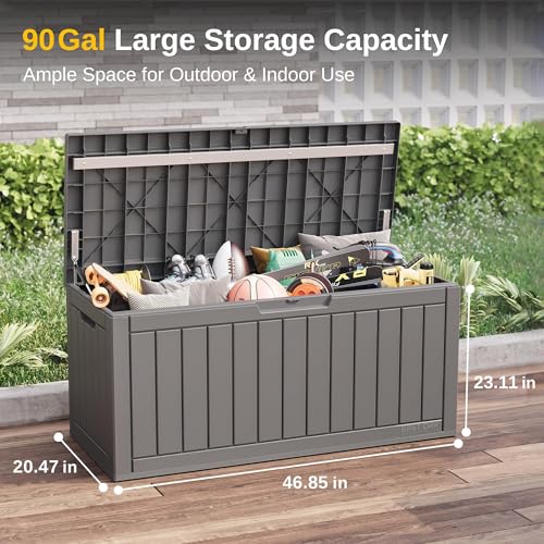 𝟵𝟬𝗚𝗔𝗟 𝗚𝗘𝗡𝗘𝗥𝗢𝗨𝗦 𝗦𝗧𝗢𝗥𝗔𝗚𝗘 𝗖𝗔𝗣𝗔𝗖𝗜𝗧𝗬: This out of doors storage box (46.85”L x 20.47”W x 23.11”H) offers ample room for cushions, gardening tools, pool supplies, and more. Store and organize your out of doors essentials efficiently