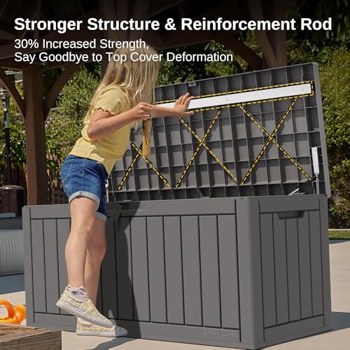 𝗥𝗢𝗕𝗨𝗦𝗧 & 𝗦𝗧𝗔𝗕𝗟𝗘 𝗗𝗘𝗦𝗜𝗚𝗡: Make stronger up to 400 lbs. Reinforced with metal rods and internal supports, providing 30% more strength. Thicker (0.08″) material and precise assembly reduce warping, making the patio storage box more stable