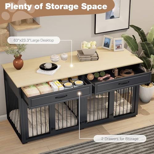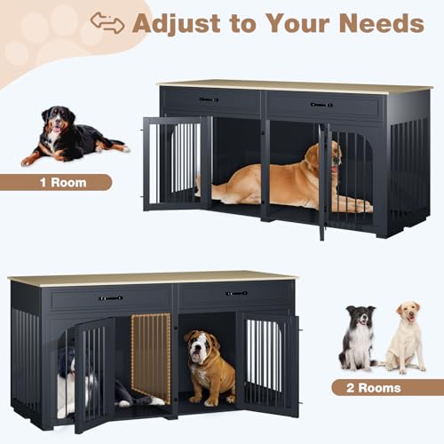 【LARGE STORAGE SPACE】The large dog crate furniture comes with two large-capacity drawers, which isn’t only a living space for your pet, but also convenient for storing toys and food for your furry friends, making your home cleaner and more organized. In addition, this wooden dog crate has an extra-large smooth tabletop, which is perfect for displaying home decorations such as plants, magazines and family photo frames.