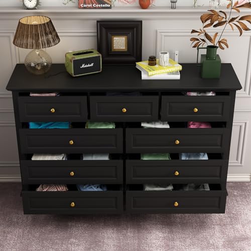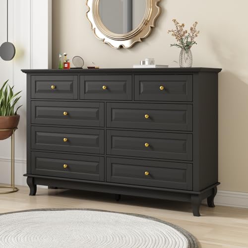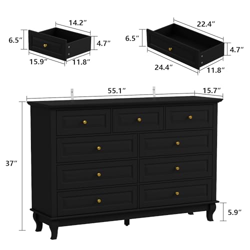 ECACAD Tall 9 Drawer Double Dresser with Carved Drawer Fronts & Solid Legs, 55.1″ L Black Modern Wood Storage Chest of Drawers for Bedroom, Living Room & Fitting Room