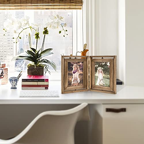 Rustic Wood Frame with Double-Sided Display: This 5×7 picture frame includes a hinged folding solid wood frame with a distressed, rustic finish, allowing you to display 4 vertical photos (2 on every side) in a 360° rotary collage.
