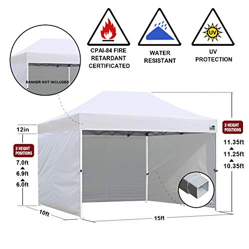 10×15 Commercial canopy tent fabric: CPAI-84 fire retardant certificated durable polyester PU coated to Block about 99% UV rays. Stitching lines are all seam sealed to prevent water penetrate from seams to make our canopy tent water-resistant. Pop up canopy top front valance with 4 name Banner sleeve to customize and personalize your Shelter. Let you attract customers. Steel D rings on each corner, easy to use a rope to protected your canopy.