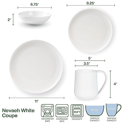Bring latest style for your dining table with Fitz and Floyd Nevaeh White Coupe Dinnerware. Every piece is manufactured from crisp, white bone china with a smooth surface and an eye-catching, up to date coupe shape with a gently swooping rim. In pristine white, it is a wonderful showcase for culinary delight and best for either formal or casual dining. 16-piece set includes 4 of Every: dinner plate measuring 11 inches in diameter by 1 inch high; salad plate measuring salad plate measures 9-1/4 inches in diameter by 3/4 inches high; 16 fluid ounce soup cereal bowl measuring 6-3/4 inches in diameter by 2 inches high; 15-fluid ounce mug measuring 5-inches long by 3-1/2 inches in diameter by 4 inches high. Oven secure as much as 350 degrees; microwave and dishwasher secure.