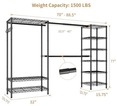 Expandable Clothing Rack: Effortlessly customize your storage space with 2 extendable hanging rods, allowing the heavy-duty rack to evolve from 70 to 88.5 inches. Overall dimensions: 15.75″Dx(70″-88.5″)Wx76.37″H, ensuring an ideal fit for diverse space dimensions.