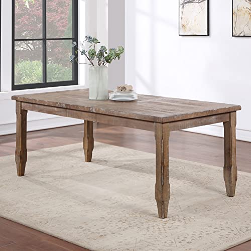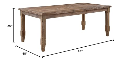 Subject material Info: Solid Hardwood, MDF. Finish: Heavily Distressed Light Brown Driftwood. Includes (1) dining table. Brand new, rustic farmhouse design. Solid wood legs. Sturdy post-style legs are chamfered and tapered. Top includes a planked look. Driftwood finish is heavily distressed with saw rasping and worm holes. Comfortably seats as much as six. Easiest for casual, relaxed dining. Product Weight: 130 lbs. Dining Table Product Size: without Leaf: 30 inches high x 64 inches wide x 40 inches deep