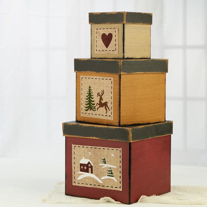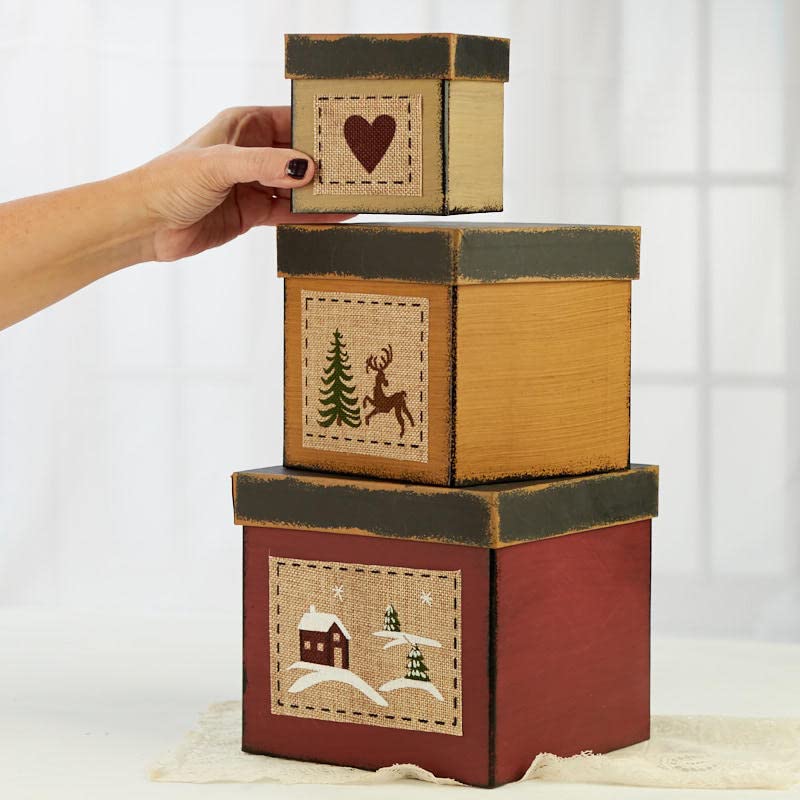 • Factory Direct Craft Set of 3 Primitive Wintry Christmas Nested Paper Mache Box Set Rustic Pre Decorated Holiday Boxes with Aged Antique Look 3 34 to 6 34