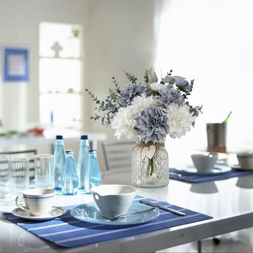 Fake Flowers in Vase:Artificial flowers for decoration include 8 blue and white artificial dahlia flowers,fake plants,eucalyptus stems,willow leavesa and matched flower arrangement rack and glass bottle,the mouth of the glass bottle is tied with hemp rope, and the bottle body has a wooden heart and a spherical pendant,give a boost to your living room,kitchen table,bathroom,fireplace,dresser,desk,coffee table decor with these realistic fake flowers in vase that bring a touch of nature indoors