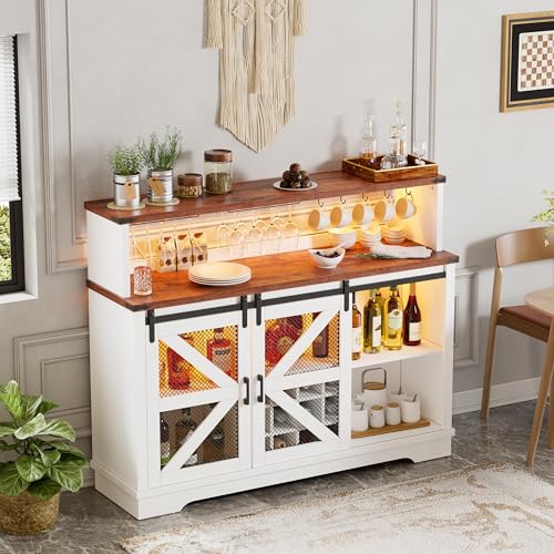 ➤Farmhouse and Classic Coffee Bar: This coffee bar cabinet is designed with sliding barn doors, which is flexible in design. The sliding door can create a symmetrical beauty on both sides or in the middle. The classic white and wood grain tabletop combination presents a farmhouse modern style design even as adding a unique visual appeal, exuding a rustic and elegant charm that can easily match plenty of home decoration styles.