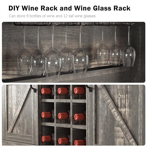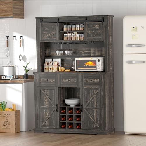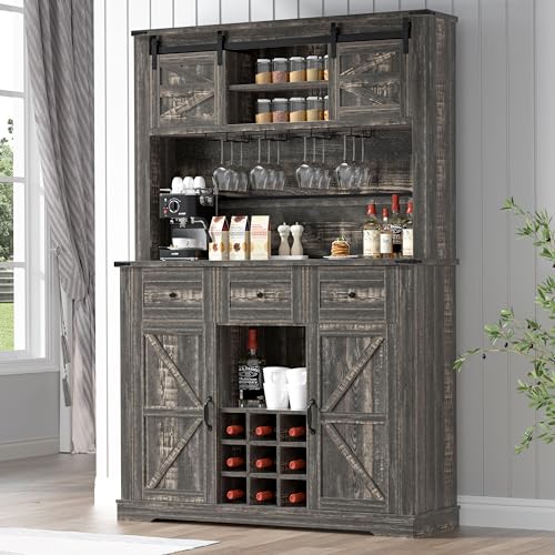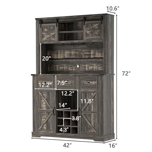 • Farmhouse Coffee Bar Cabinet72 Kitchen Hutch with Storage Buffet Sideboard Cupboard with Adjustable Shelves Sliding Barn Door Wine Glasses Rack for Kitchen Dining Room Dark Rustic Oak