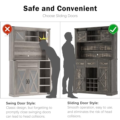 【Farmhouse Elegance and Safety Design】We proudly present our stunning farmhouse kitchen cabinet, meticulously crafted from engineered wood to verify long-lasting durability. Breaking away from tradition, we introduce an elegant sliding door design above the kitchen wine cabinet. This innovative choice helps to keep away from potential collisions and make stronger the safety.