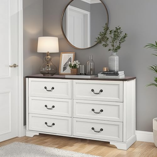 Farmhouse Wood Dresser: Featuring a beautiful antique white finish combined with dark rustic oak top panel and vintage knobs on Each and every drawer, this farmhouse double dresser is the very best combination of modern and farmhouse style. The natural grain of the finish and vintage design add a sense of nostalgia and style.