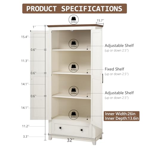 Spacious and Versatile: Measuring 32″W x 15.8″D x 72″H, this freestanding cabinet offers ample storage with two adjustable shelves, a soft-close drawer, and a generous interior space ideal for kitchen, lounge, toilet, or entryway use.