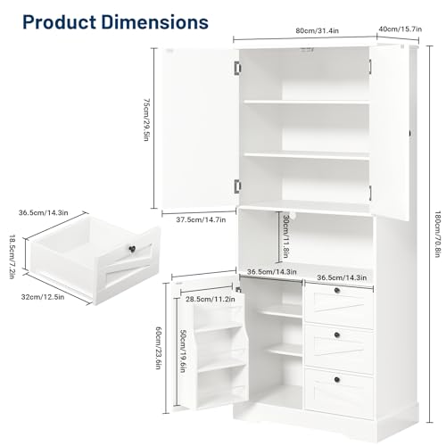 32-inch-wide Pantry Storage Cabinet: A spacious countertop fits a microwave and coffee maker. Three door cabinets and three drawers store utensils and appliances well. A three-layer door-side rack provides extra space for condiments and small jars.